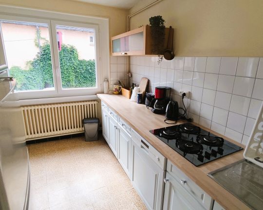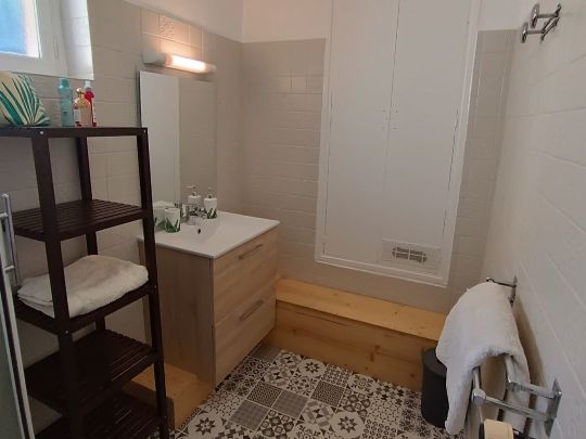 Une salle de bain avec douche et un WC indépendant. Une cuisine équipée avec un lave-vaisselle et une agréable pièce à vivre.